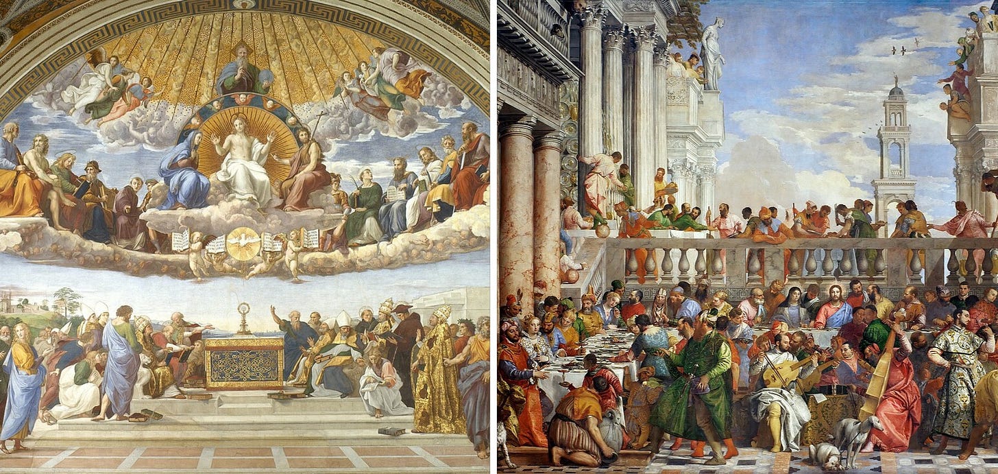 If we compare Raphael’s Disputation of the Holy Sacrament to Paolo Veronese’s The Wedding at Cana, in the first we find a harmony of lines, a grace of invention that is a pleasure for the eyes as for the spirit. However, the contrasting movements of the figures and the great care taken with forms in general give the composition a sort of coldness; these saints and Doctors seem not to know each other, and each of them seems to be frozen for eternity. In Veronese’s feast, I see men as I encounter them around me, varied faces and moods, conversing and exchanging ideas, the sanguine beside the bilious, the flirtatious beside the indifferent or distracted woman; in sum, life and movement. I do not speak of the air, the light, or the effects of color, which are incomparable.